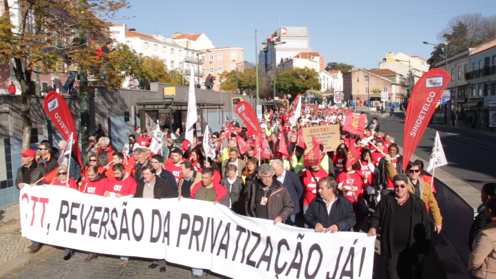 Na manifestação que se realizou hoje pela reversão da privatização dos CTT, na delegação do PCP integrada pelo Secretário-Geral, Jerónimo de Sousa afirmou que "PSD, CDS e PS procuram lavar as mãos da responsabilidade que tiveram na privatização, com o agravamento da situação não ouvindo nem os trabalhadores, muitos deles ameaçados de despedimento, nem ouvindo as populações que vêem os serviços a degradarem-se e a fecharem. Este é o problema de fundo a que é preciso dar resposta salvando os CTT, tendo em conta o interesse público, dos trabalhadores e das populações".